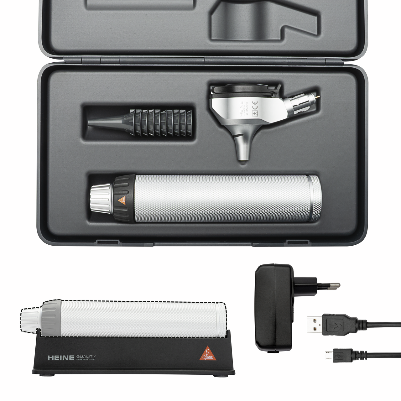 HEINE BETA 400 LED F.O. Otoscope Head, HEINE BETA4 USB Rechargeable Handle, HEINE AllSpec Disposable Tips Ø 4 mm (10x), BETA 200 | BETA 400 LED F.O. Otoscope Hard Case