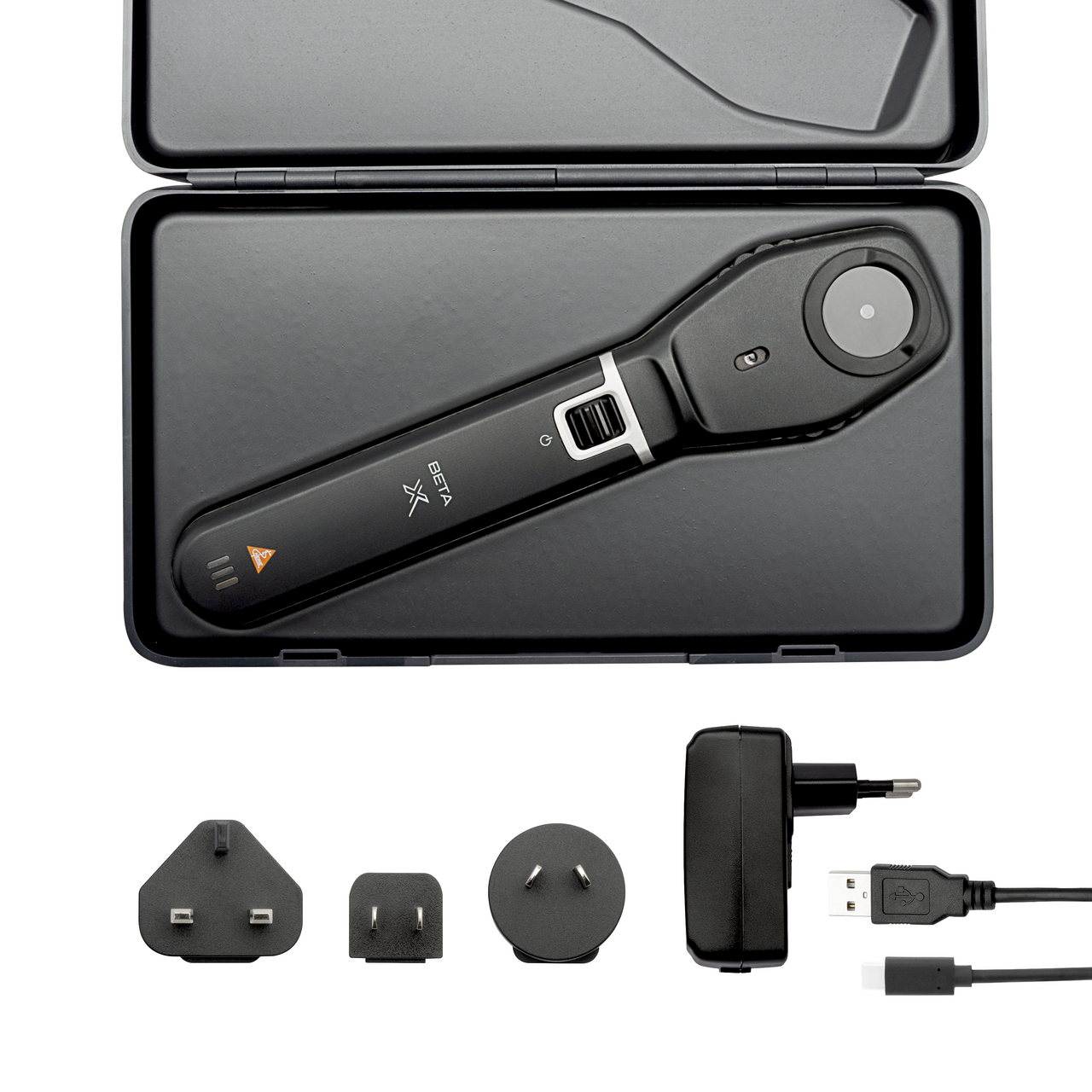 HEINE BETA X Ophthalmoscope, HEINE E4-USBC Power Supply, HEINE Country Adapter Set E4/E12, HEINE BETA X Ophthalmoscope Hard Case