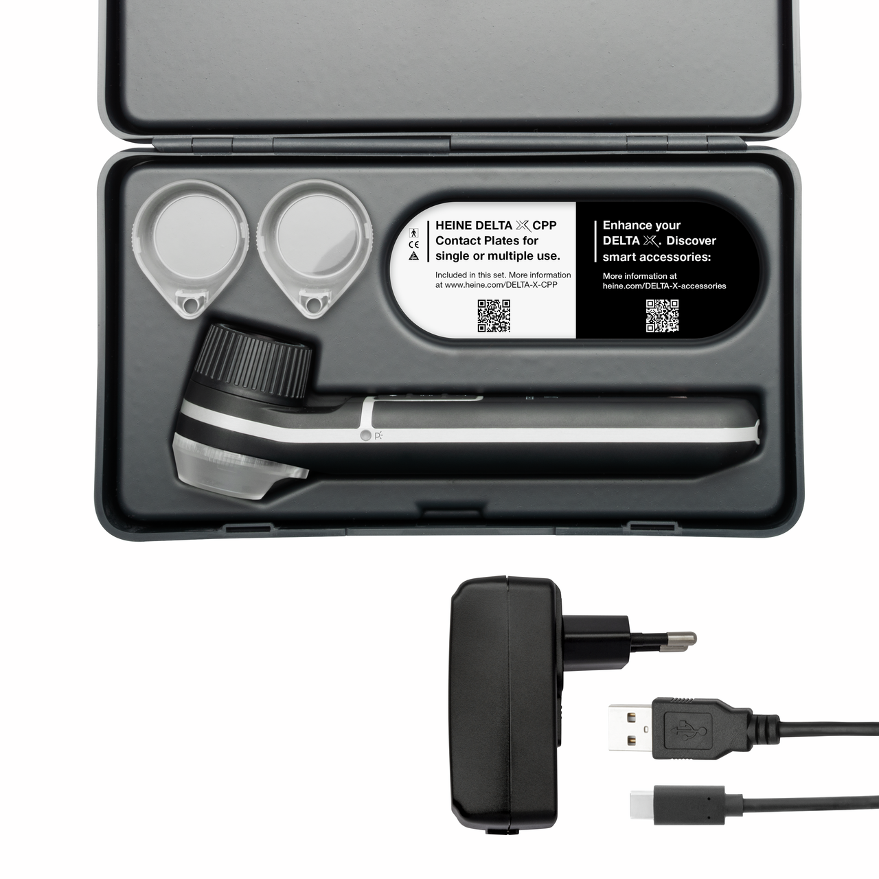 HEINE DELTA X Dermatoscope, HEINE E4-USBC Power Supply, HEINE DELTA X CPP Contact Plate (3x), HEINE DELTA X Dermatoscope Hard Case