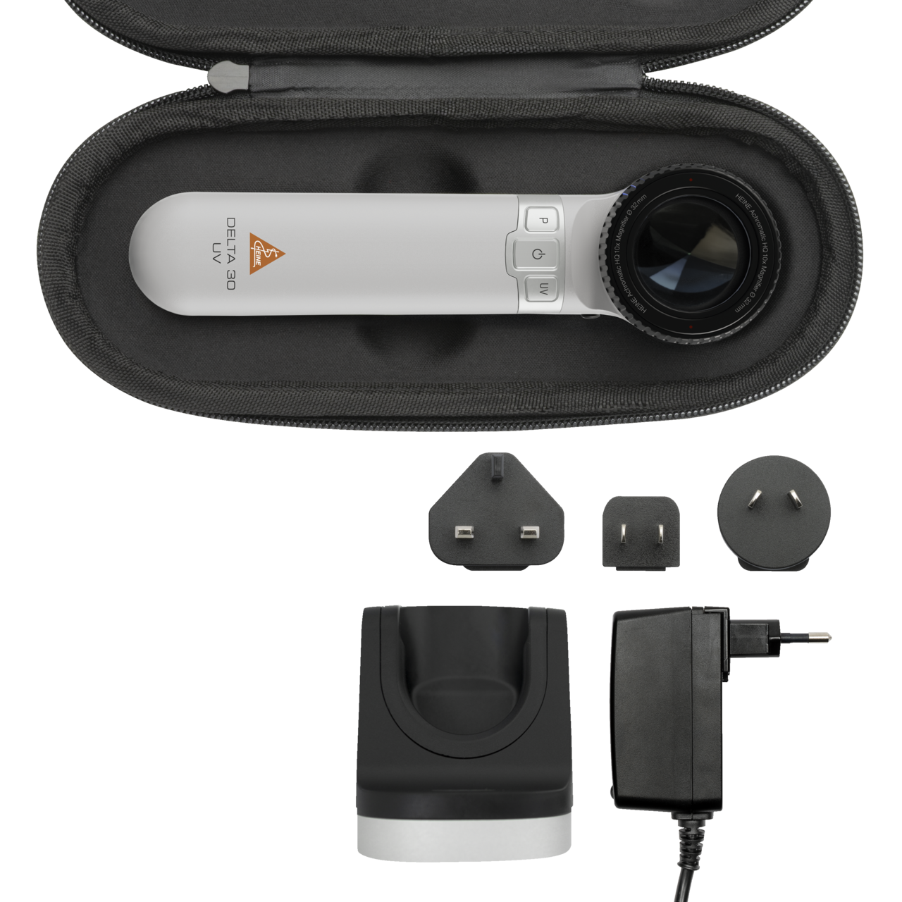 HEINE DELTA 30 UV Dermatoscope, HEINE Charger 30 Table Charging Station, HEINE DELTA 30 Zippered Storage Case, HEINE Country Adapter Set E4/E12